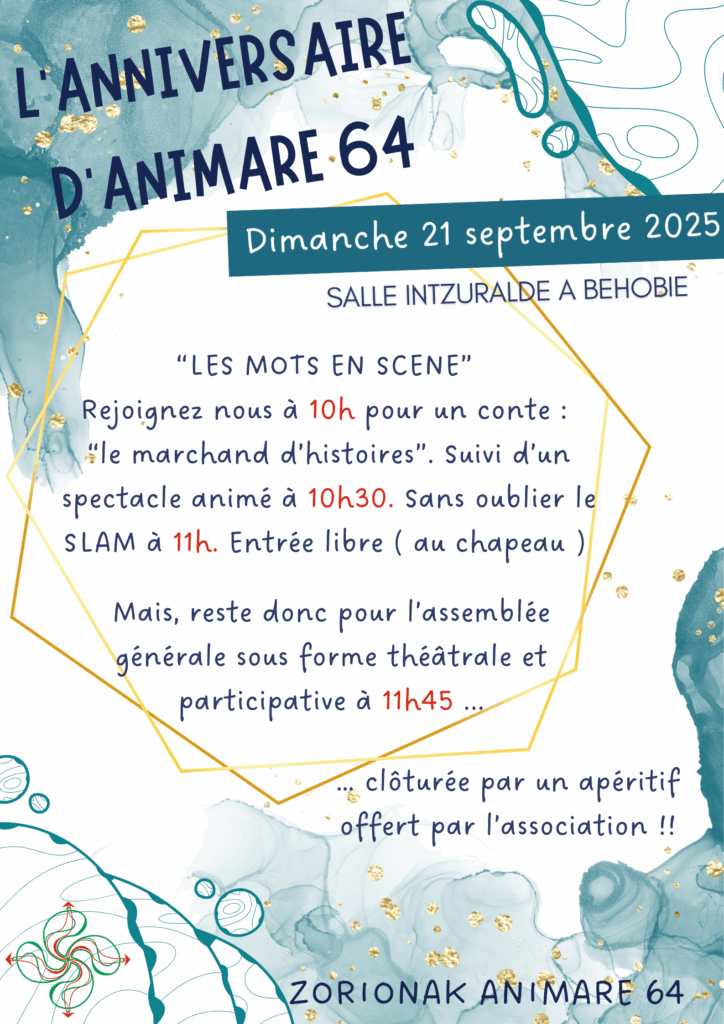 Mais nous voulons surtout vous annoncer que cette année, nous fêtons nos 5 ans d’existence, alors venez fêter cela avec nous, rdv le dimanche 21 septembre à la salle Intzuralde à béhobie. Spectacles pour grands et petits au programme dès le matin !